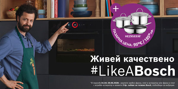 В периода 01.04. - 30.06.2026 г. закупeте заедно фурна, плот и аспиратор или фурна и плот с вграден аспиратор, и вземете 3 бр. съдове за готвене Bosch от неръждаема стомана, подходящи за индукция (повече за подаръка).